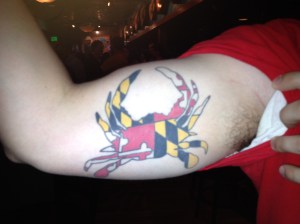 I ran into Chris at a local bar called Hightopps the other night.  You see a lot of crab tattoos in Maryland but this is the first one I’ve come across that was designed with the colors of the Maryland State Flag.  It definitely caught my eye.